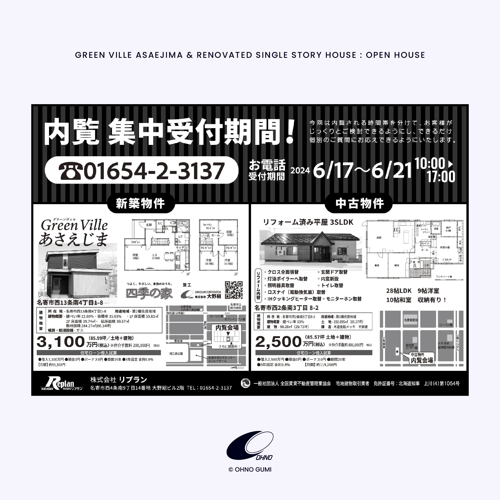 内覧のご予約は「6月17日(月)〜6月21日(金)|株式会社REPLAN(TEL.01654-2-3137)」までご連絡ください。