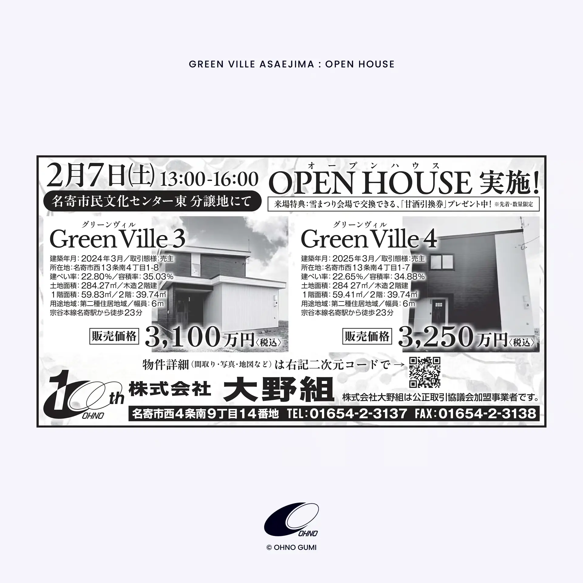 【オープンハウス】 日時:令和8年2月7日(土) 時間:13時00分〜16時00分まで 会場:名寄市西13条南4丁目1-10(名寄文化センター東側)